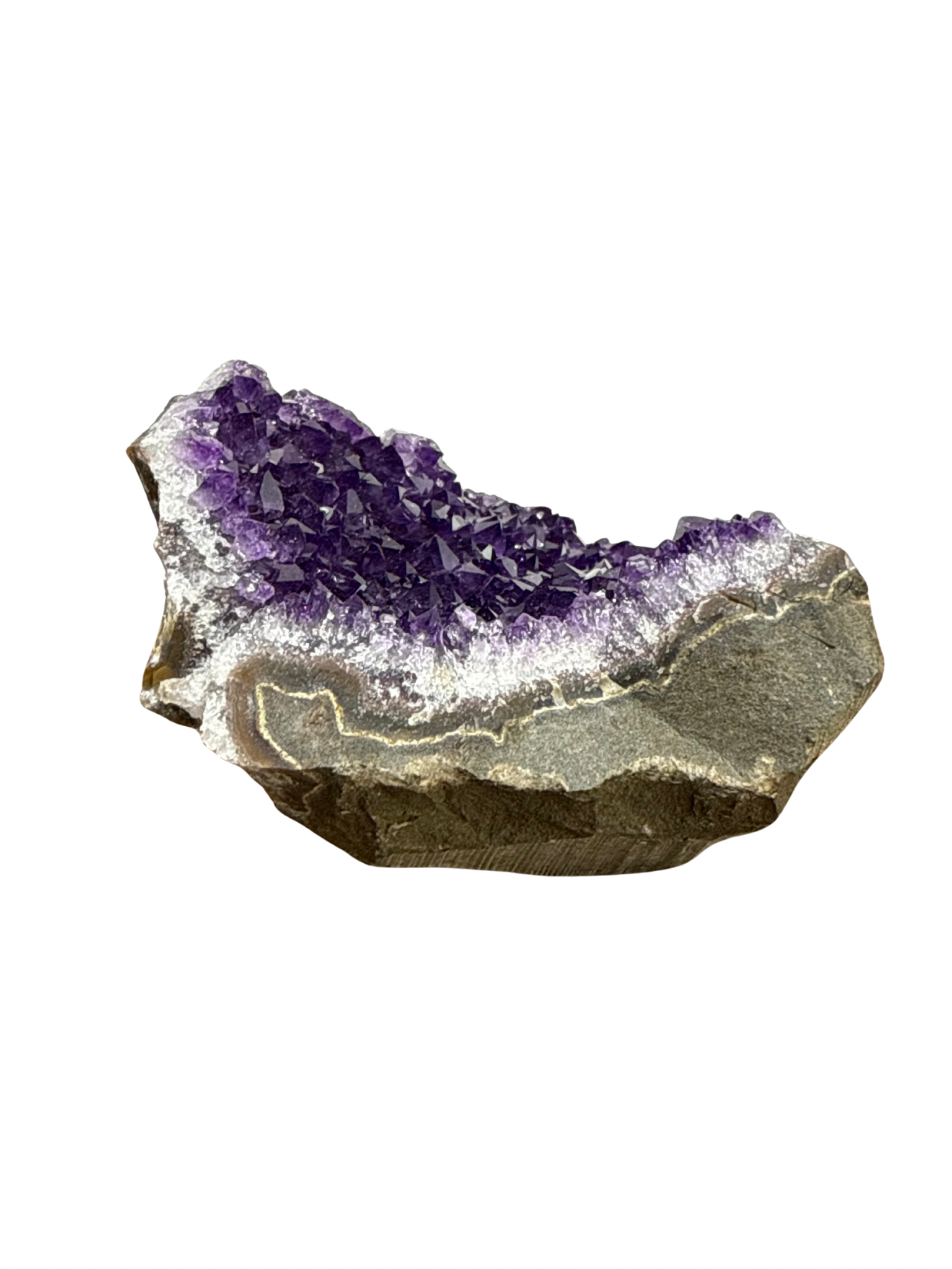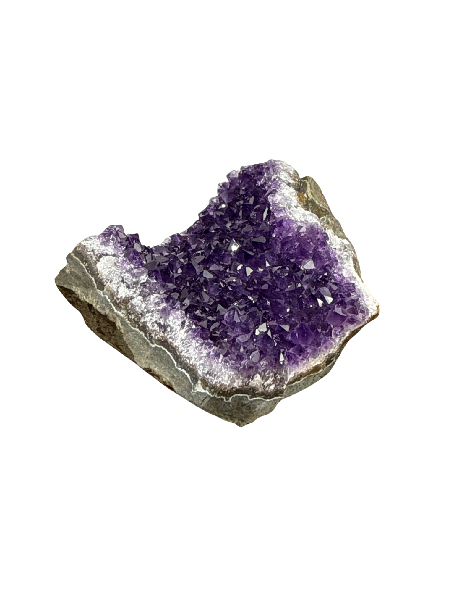 Prachtig Amethist cluster van A-kwaliteit met dieppaarse grote kristallen, heeft een rustgevende en beschermende energie. Perfect om te combineren met bijvoorbeeld een stuk Rozenkwarts en Bergkristal.