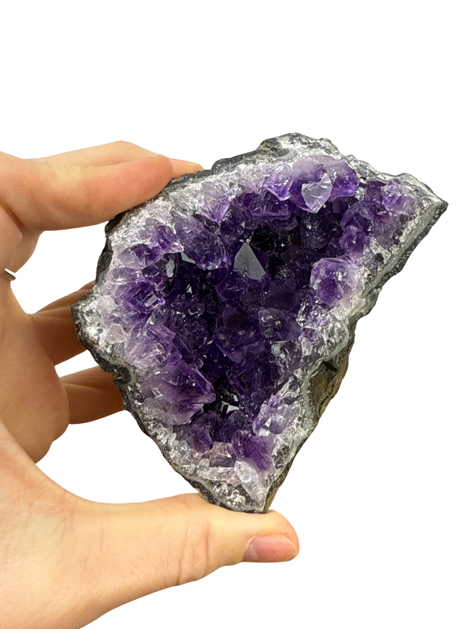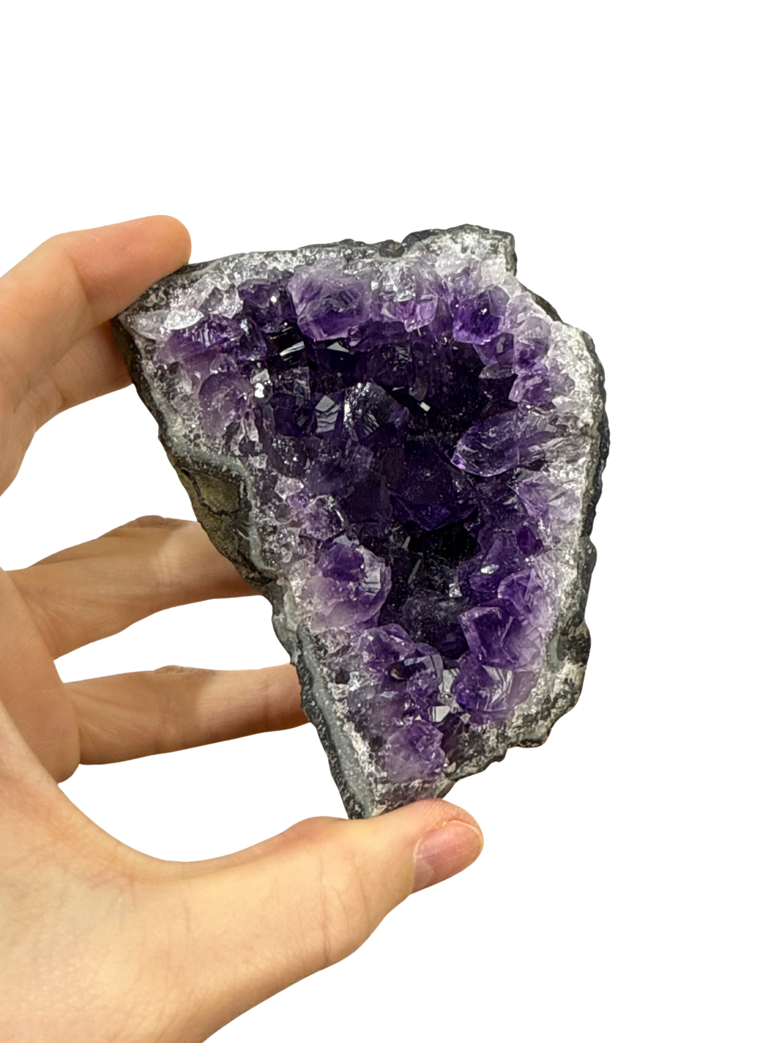 Prachtig Amethist cluster met dieppaarse kristallen, heeft een rustgevende en beschermende energie. Perfect om te combineren met bijvoorbeeld een stuk Rozenkwarts en Bergkristal.