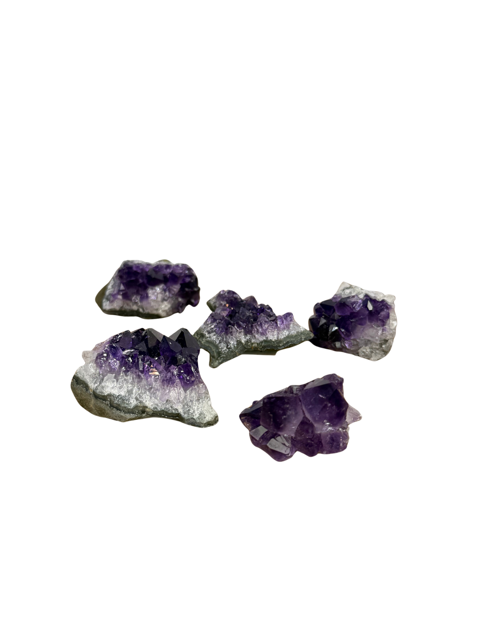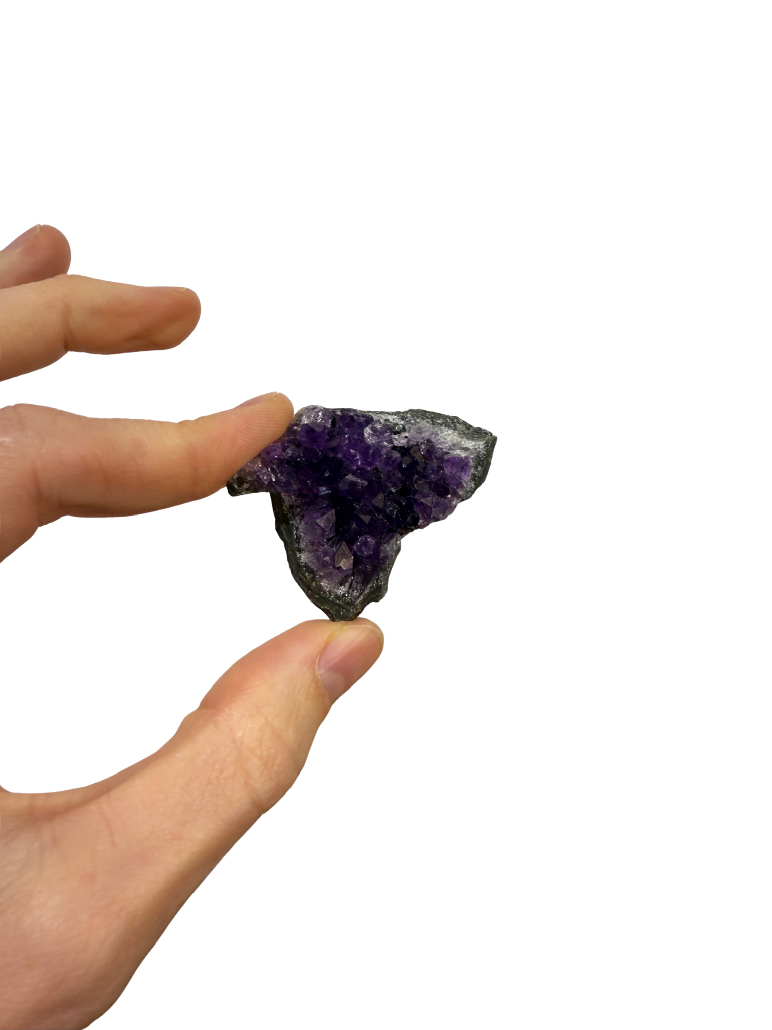 Prachtig kleine Amethist cluster met dieppaarse kristallen, heeft een rustgevende en beschermende energie. Perfect om te combineren met bijvoorbeeld een stuk Rozenkwarts en Bergkristal.