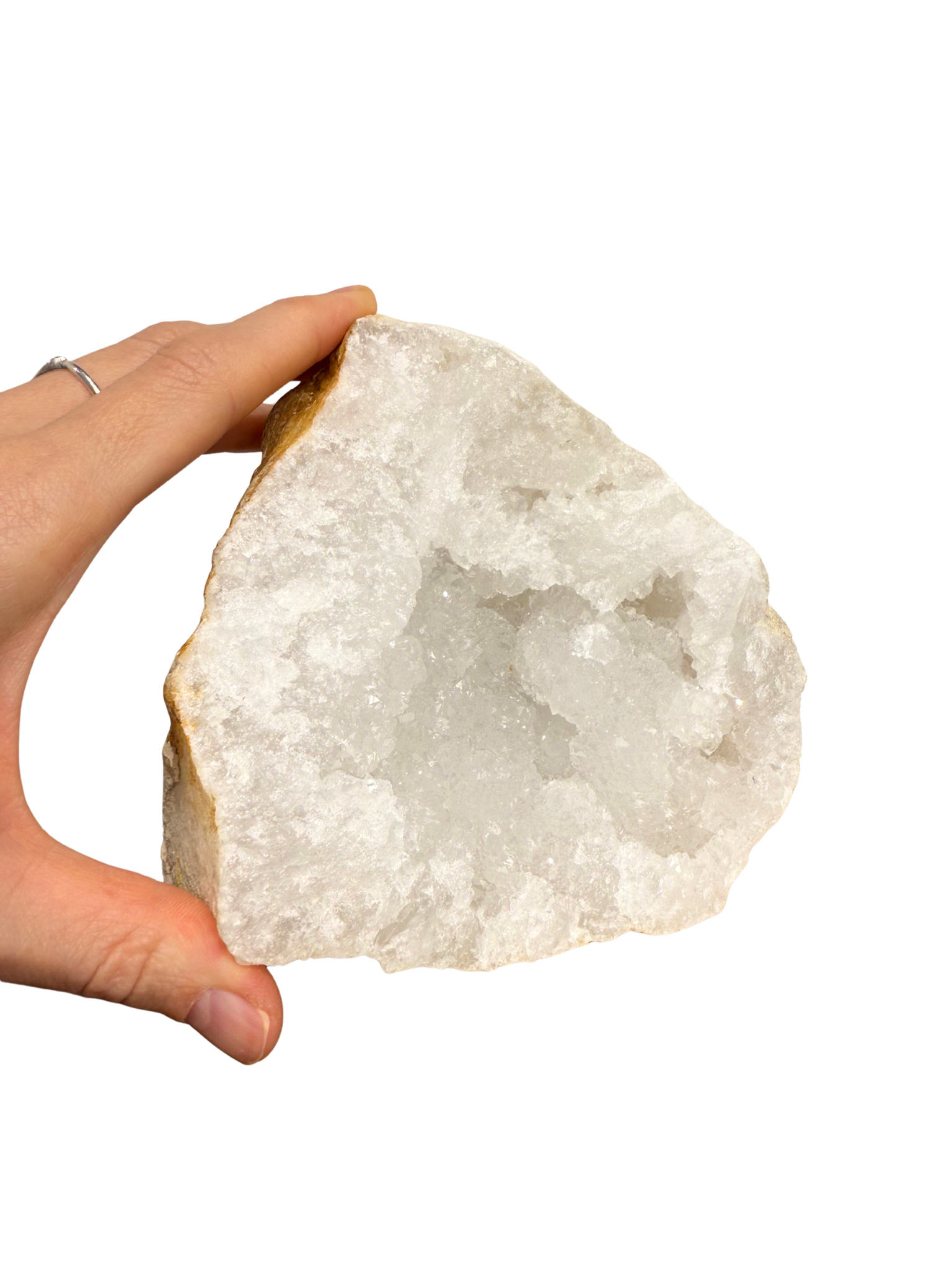Deze halve kwarts geode schittert van binnen met heldere kristallen en brengt zuiverende energie in elke ruimte. Perfect als decoratie of energetische versterker.