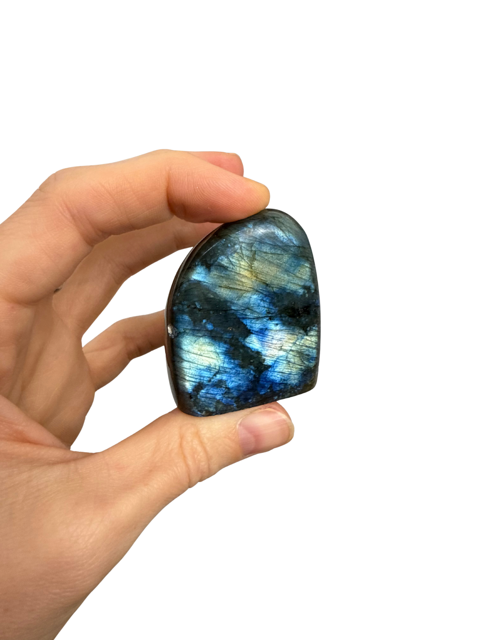 Laat je verrassen door de magie van deze geslepen Labradoriet sculptuur!Â
