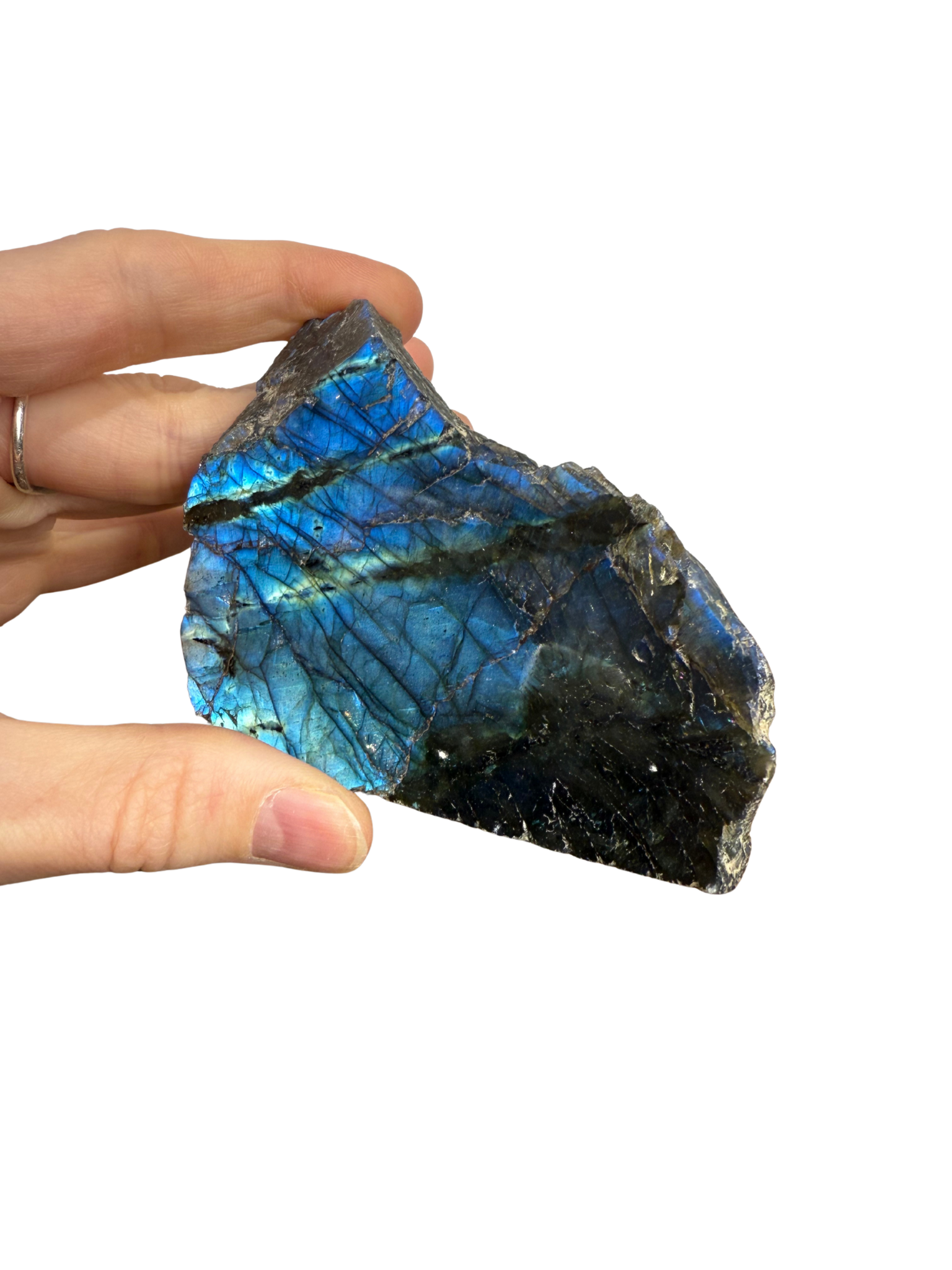 Deze unieke Labradoriet sculptuur heeft een ruwe, natuurlijke achterkant en een gepolijste voorkant met kleurrijke flash. Bekend om zijn beschermende en intuïtie versterkende werking, is dit een krachtig en stijlvol stuk voor elke ruimte.