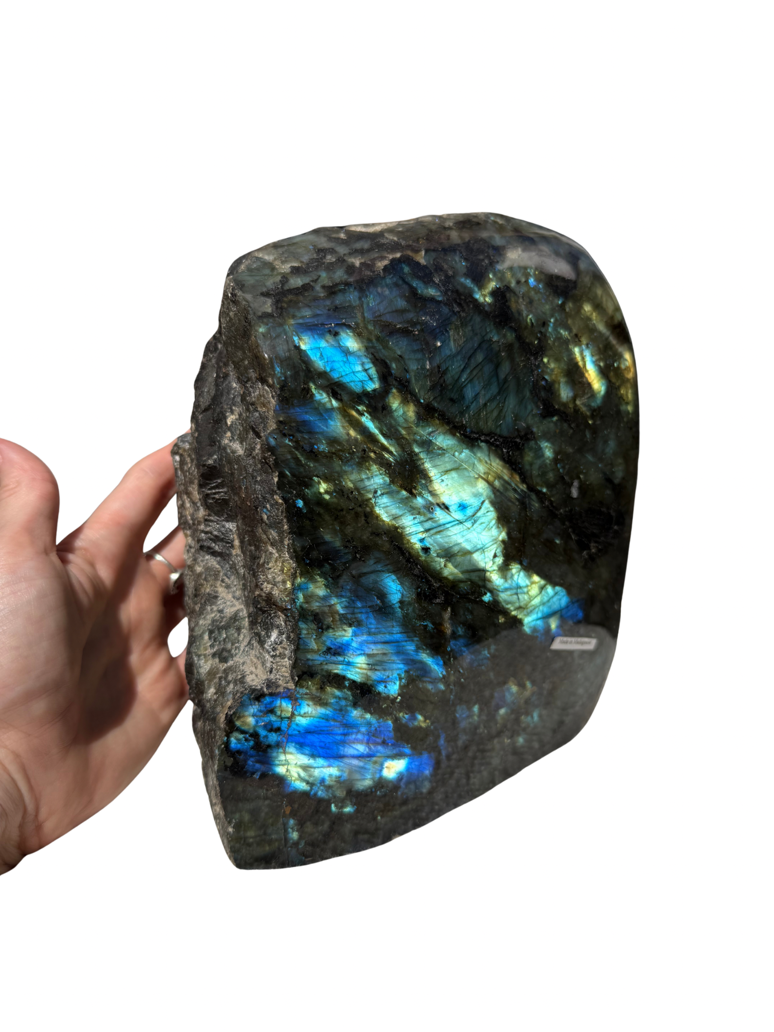 Deze unieke XXL Labradoriet sculptuur heeft een ruwe, natuurlijke achterkant en een gepolijste voorkant met kleurrijke flash. Bekend om zijn beschermende en intuïtie versterkende werking, is dit een krachtig statement piece voor in de woonkamer!