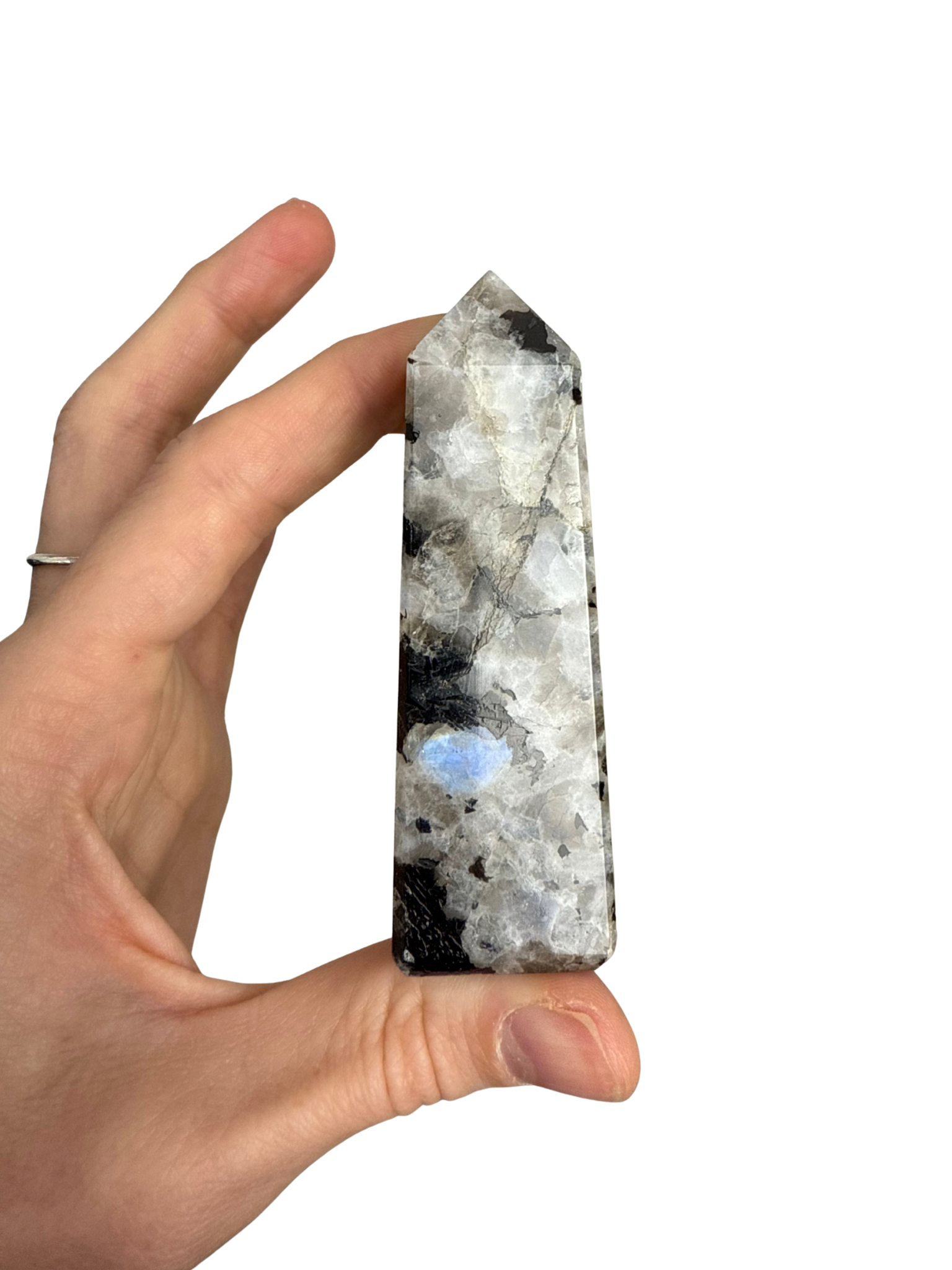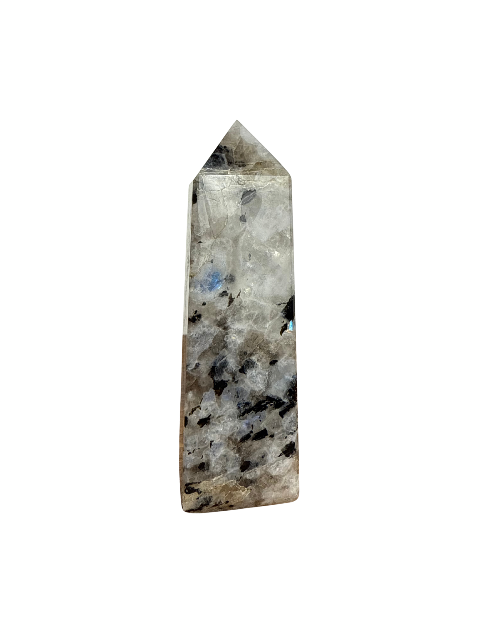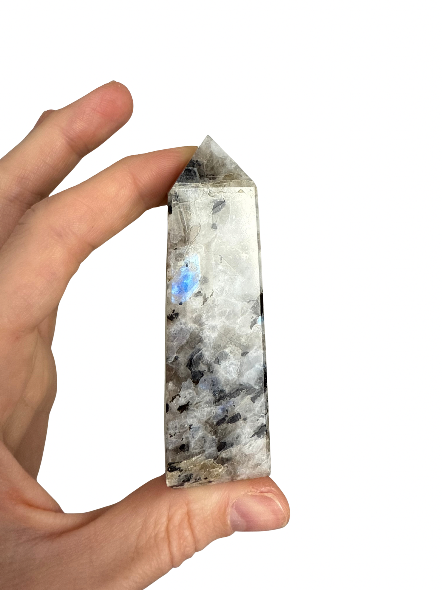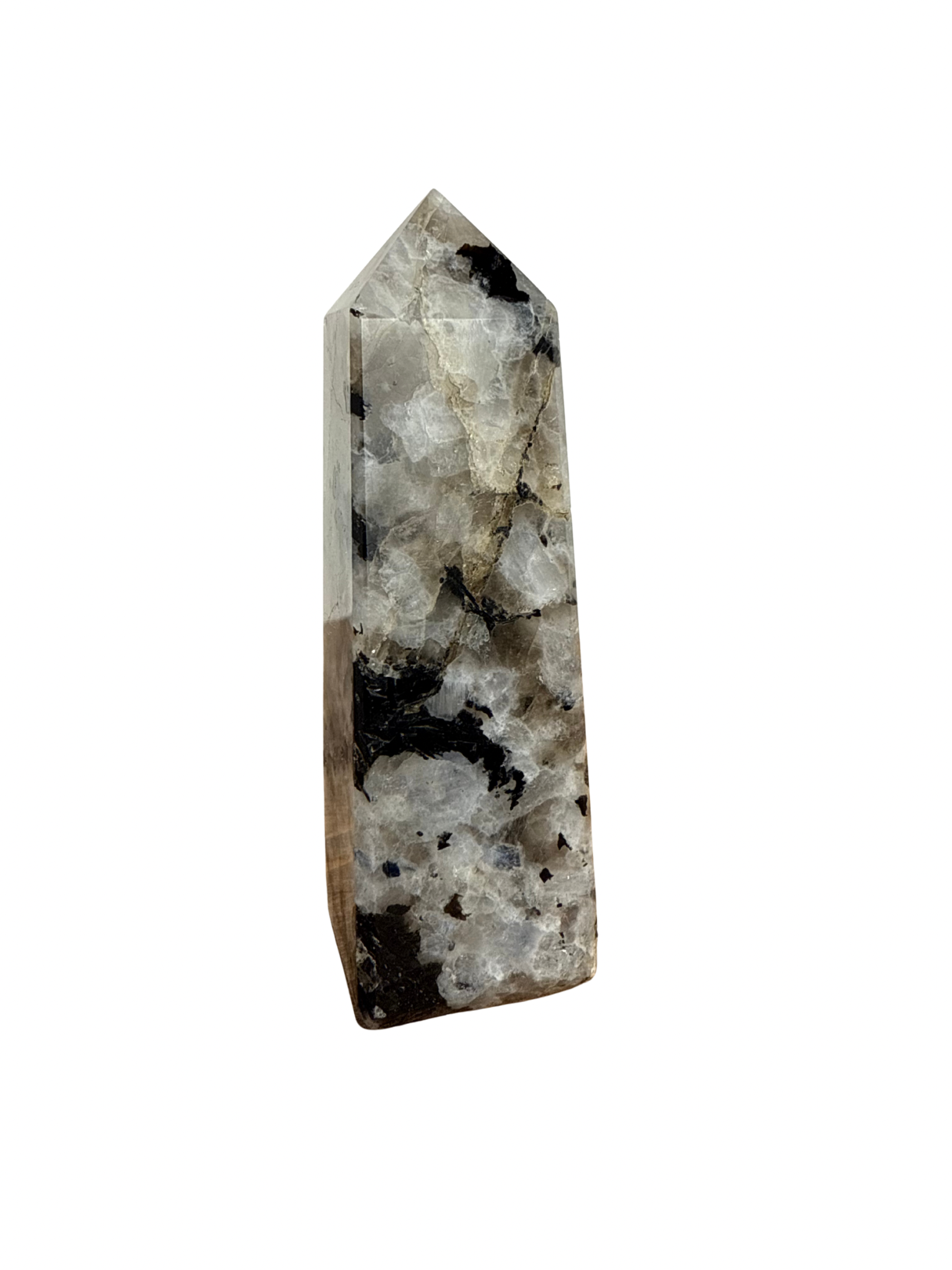 Deze Regenboog Maansteen toren(witte Labradoriet) is een steen die je verbindt met je intuïtie, innerlijke wijsheid en vrouwelijke energie.Â