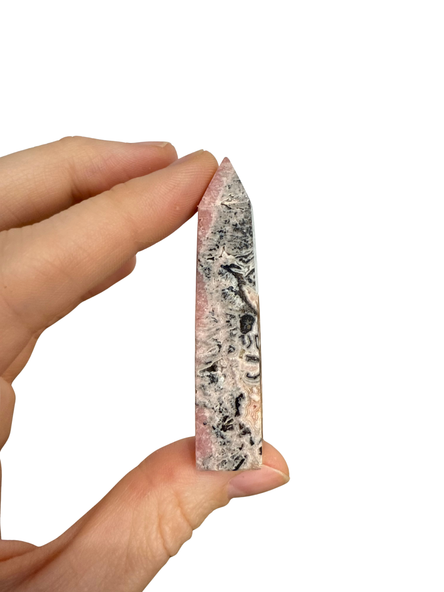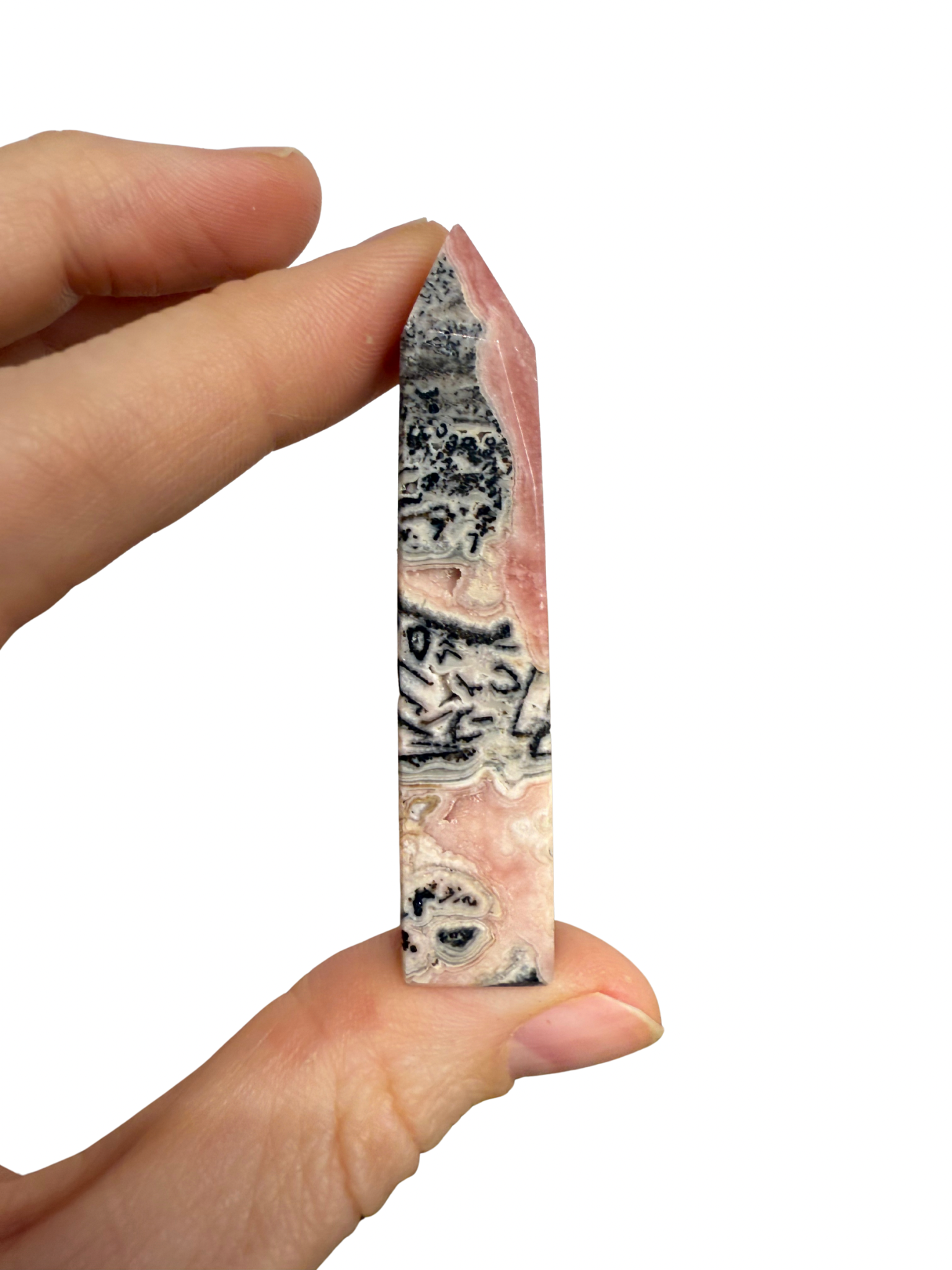 Rhodochrosiet is een fijne steen voor zachtheid en zelfliefde, het leert je keuzes te maken vanuit je hart. Deze prachtig gepolijste toren is een must-have in je collectie.