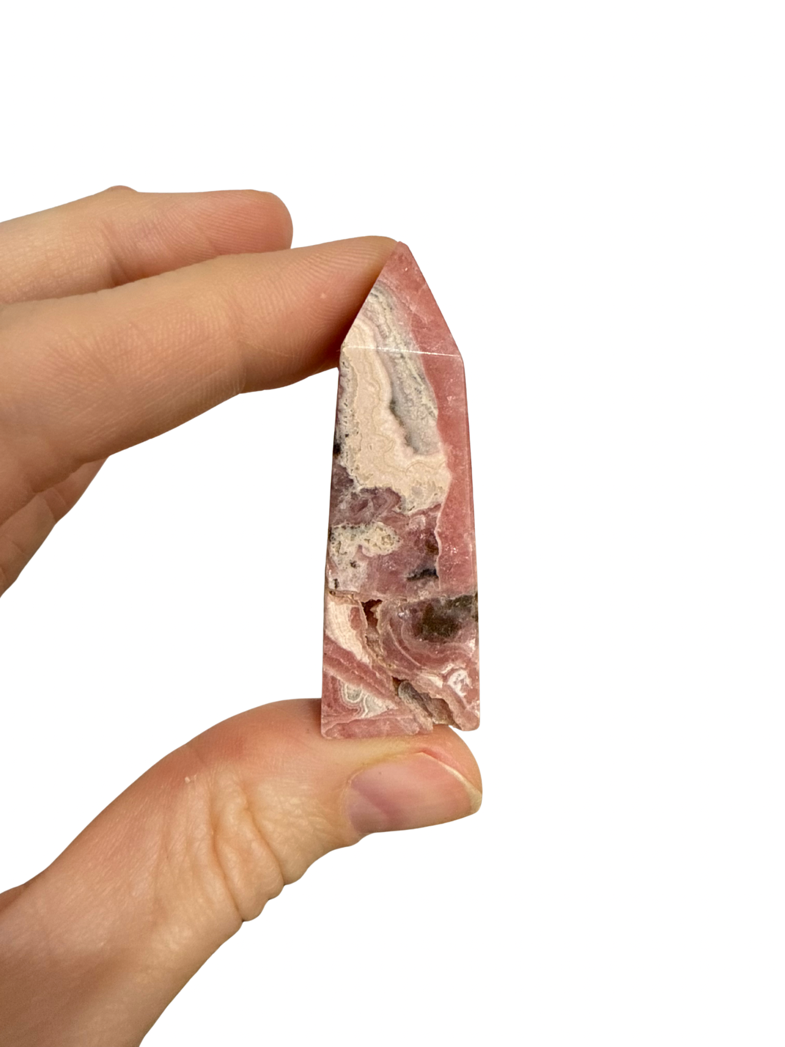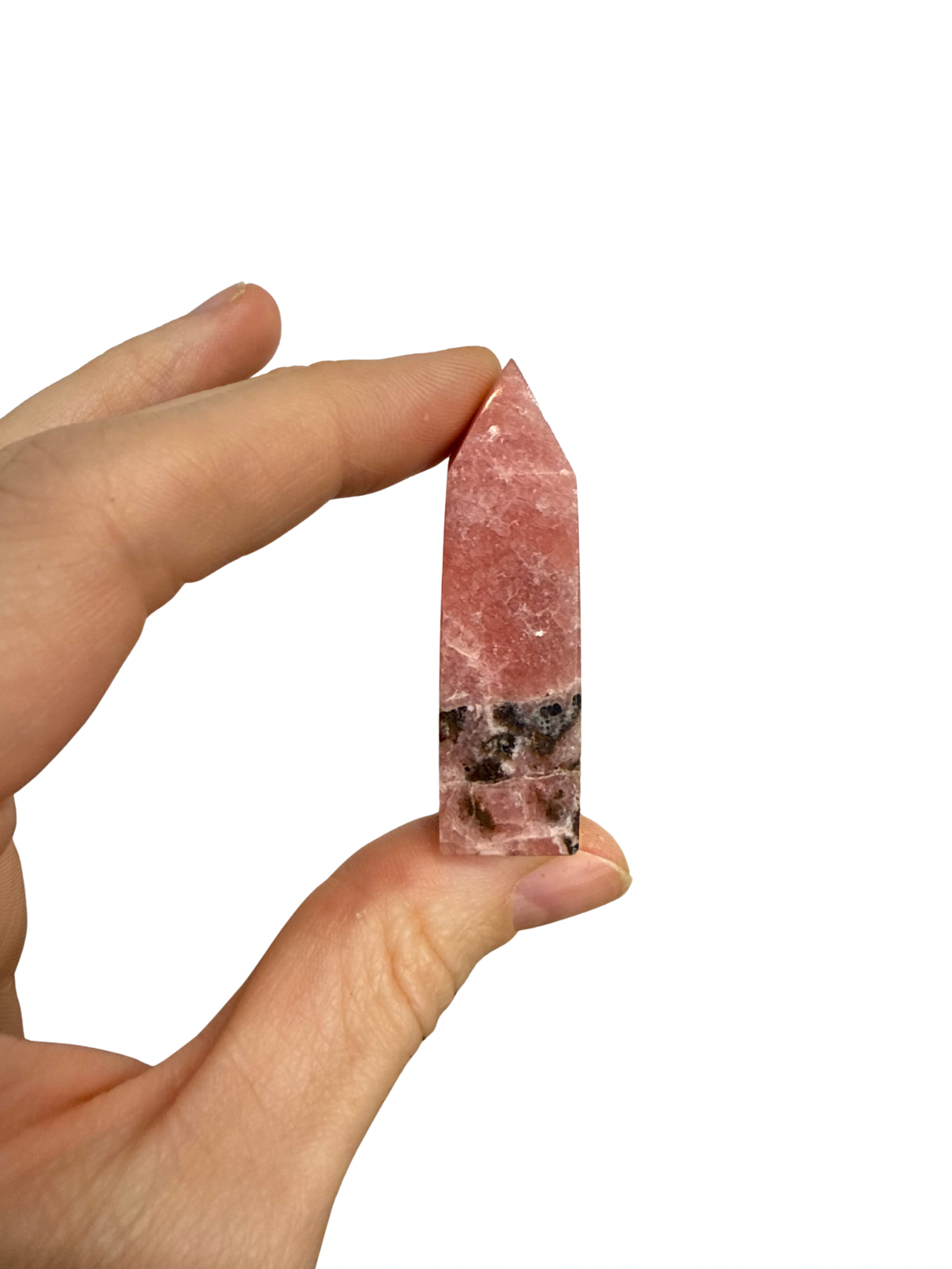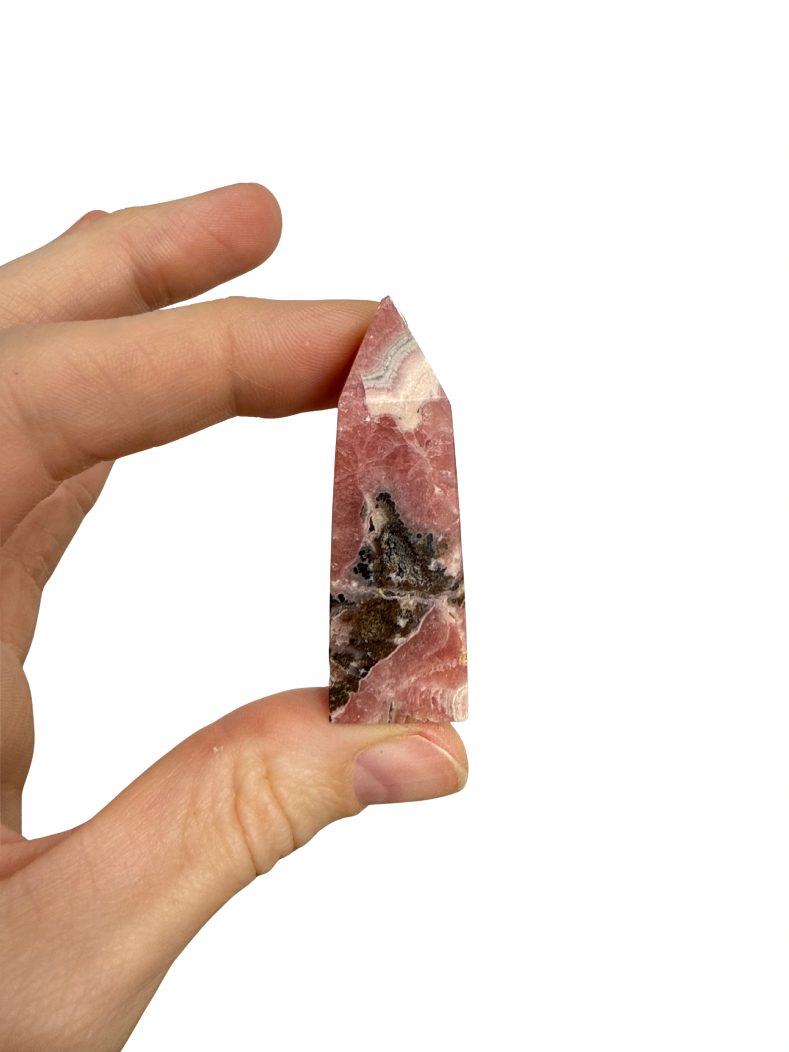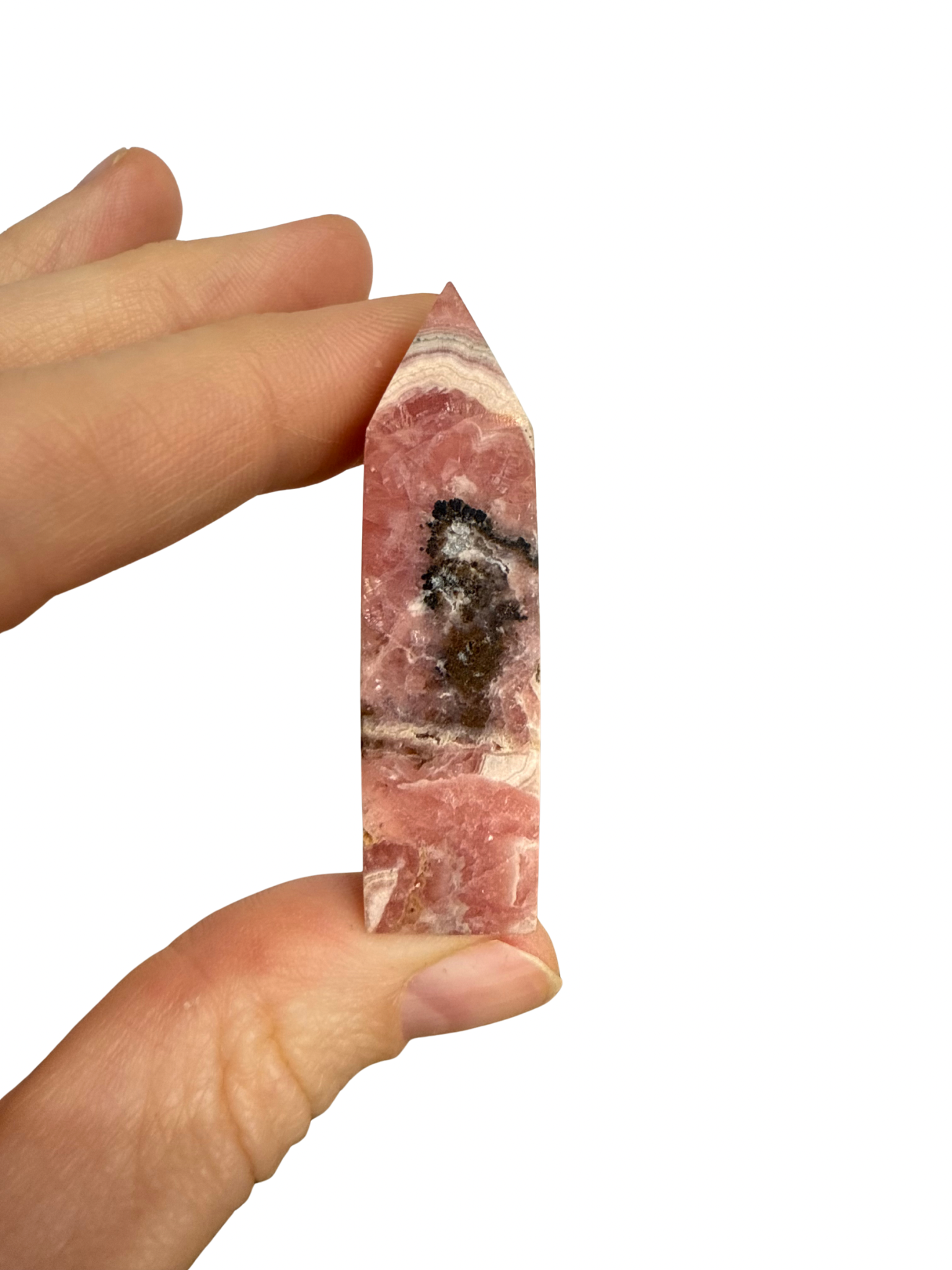 Rhodochrosiet is een fijne steen voor zachtheid en zelfliefde, het leert je keuzes te maken vanuit je hart. Deze prachtig gepolijste toren is een must-have in je collectie.