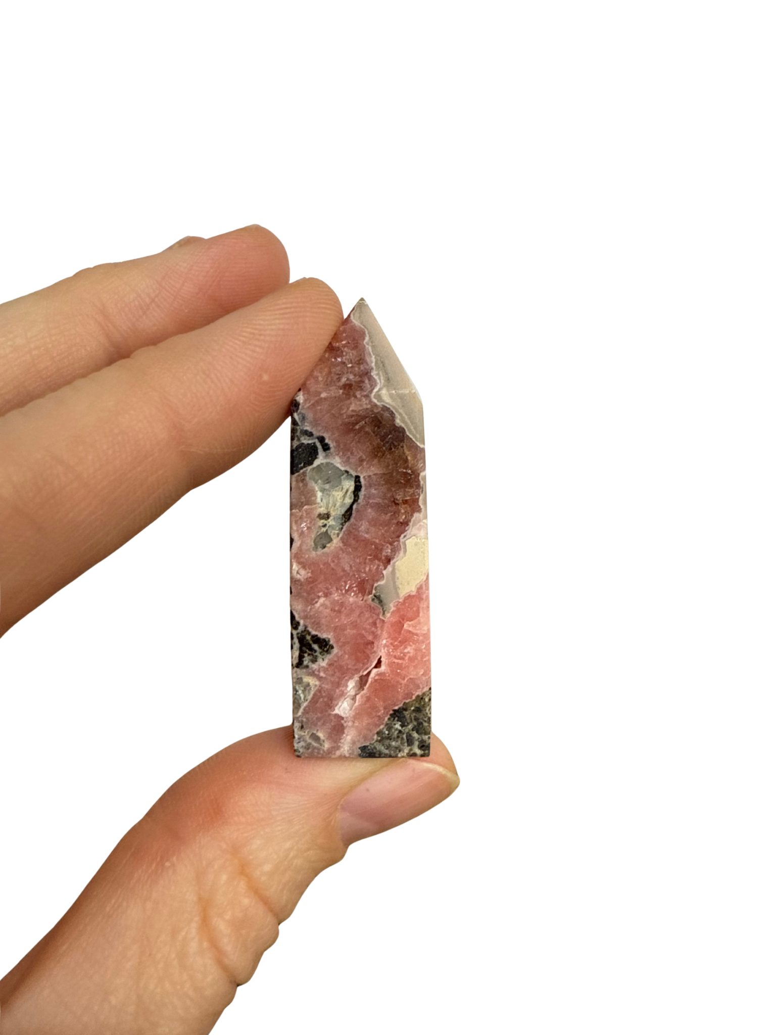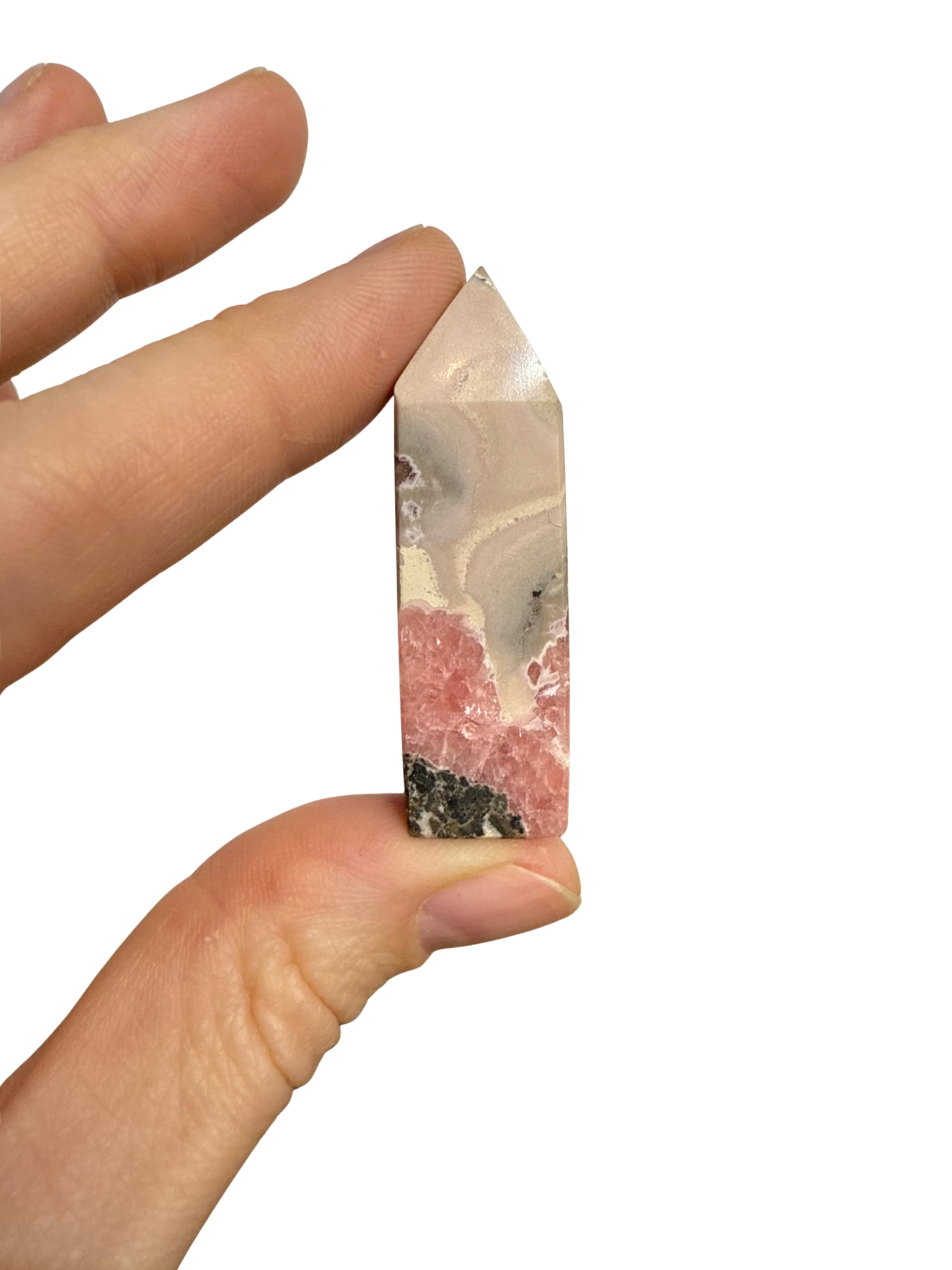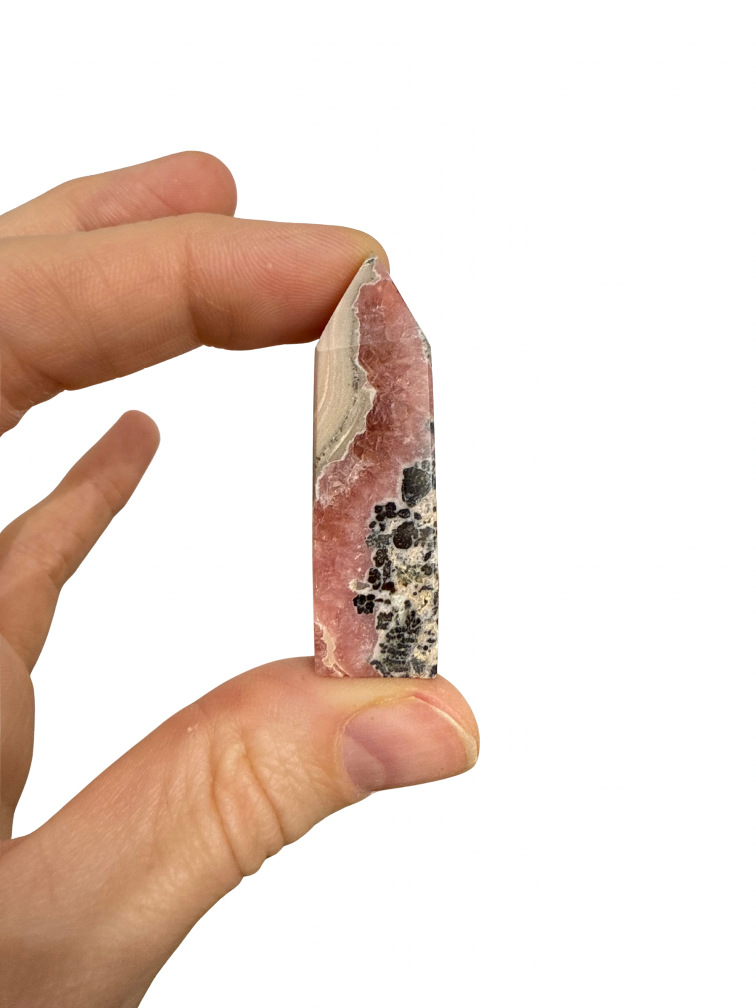 Rhodochrosiet is een fijne steen voor zachtheid en zelfliefde, het leert je keuzes te maken vanuit je hart. Deze prachtig gepolijste toren is een must-have in je collectie.