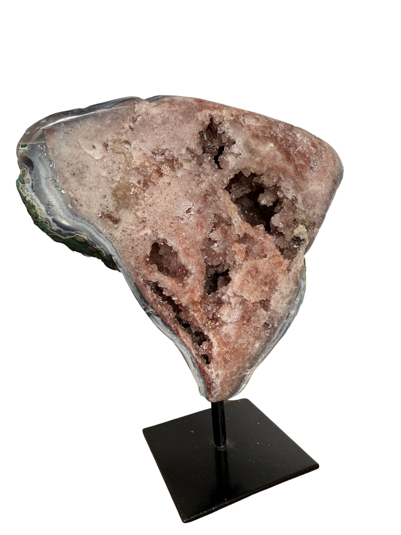 Deze unieke Roze Amethist (Chalcedoon) op standaard is een echte eyecatcher. De combinatie van Roze Chalcedoon met glinsterende Kwarts straalt zachte, maar krachtige energie uit. Roze amethist staat bekend om haar kalmerende werking, bevordert liefdevolle verbinding en beschermt je aura op een subtiele manier.Â