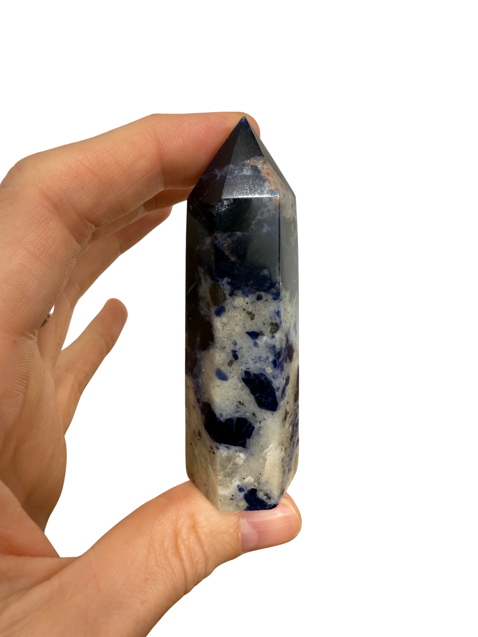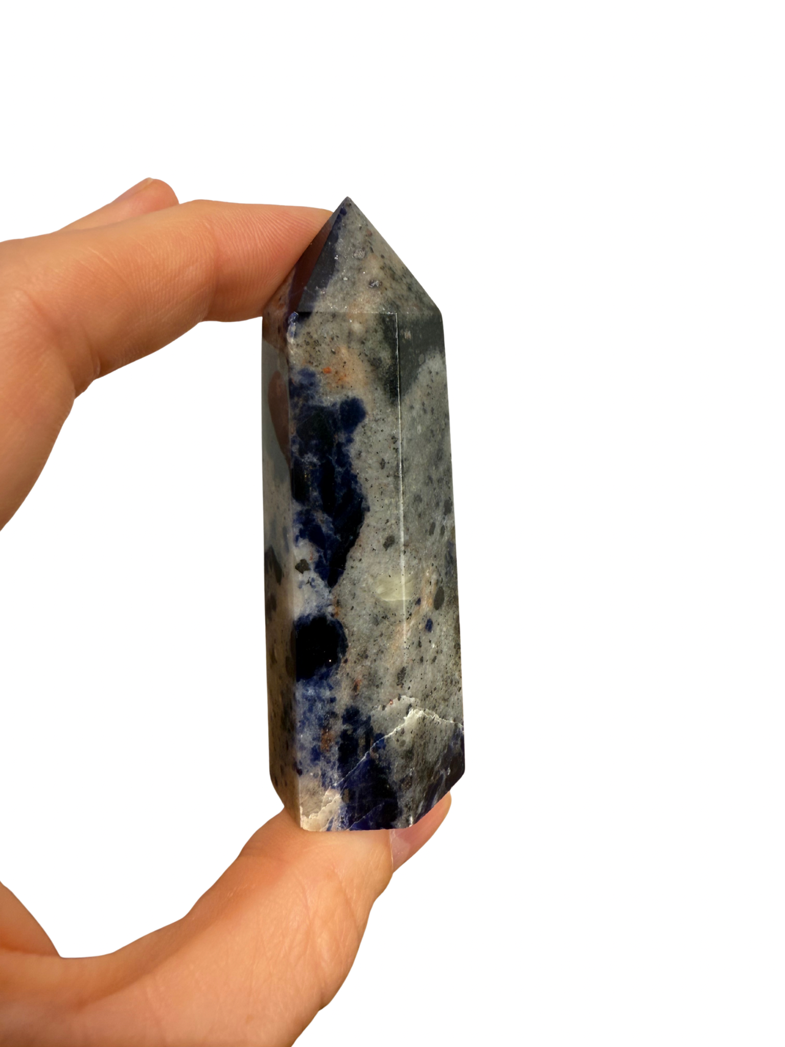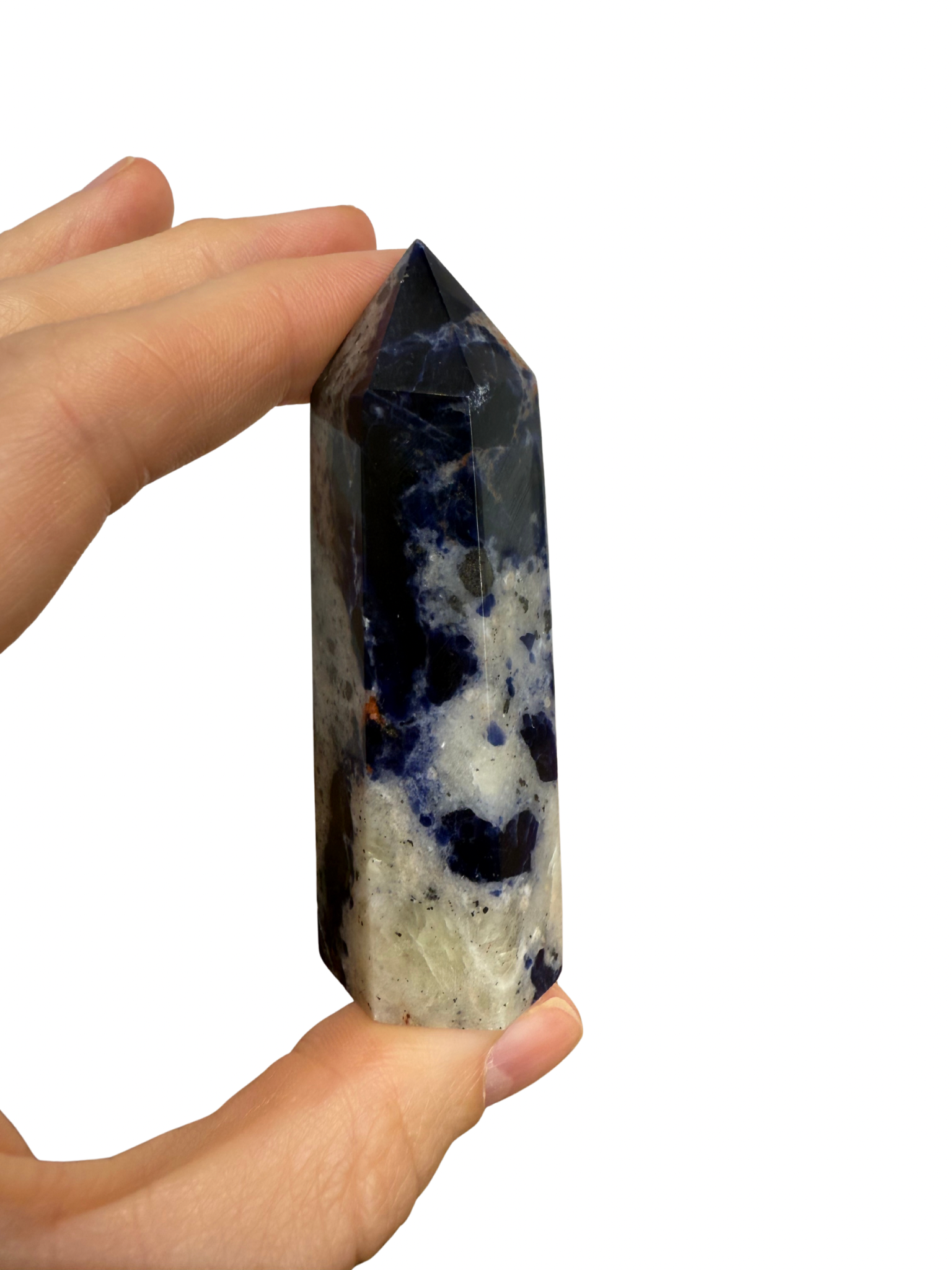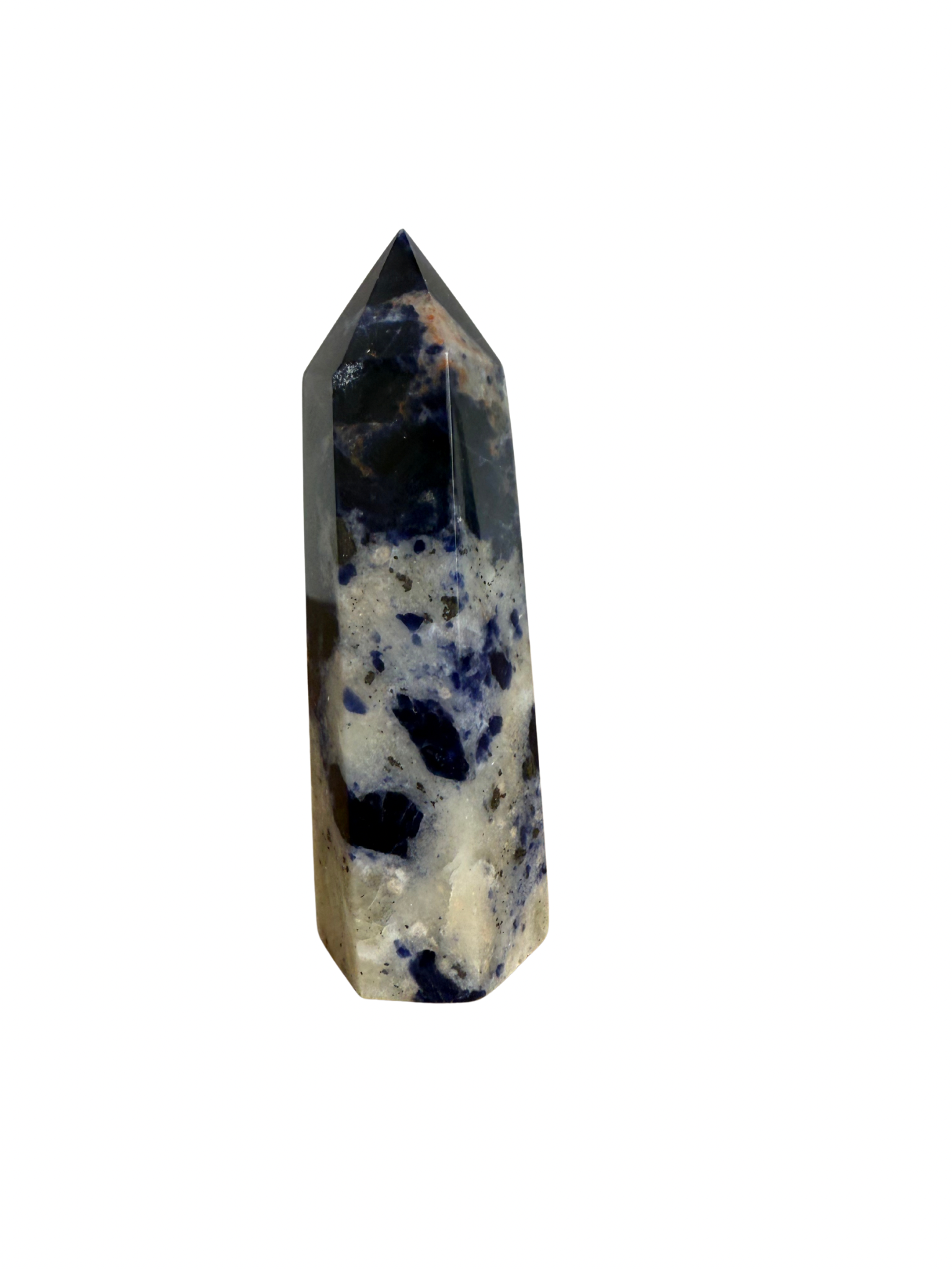 Deze prachtige Sodaliet toren combineert diepe blauwe tinten met witte aders. Sodaliet staat bekend als de steen van inzicht en communicatie, hij helpt je helder denken, eerlijk uitspreken wat je voelt en vertrouwen op je intuïtie.