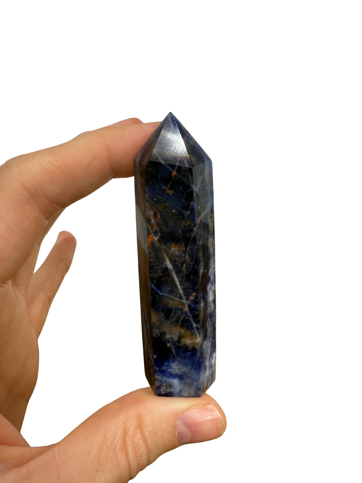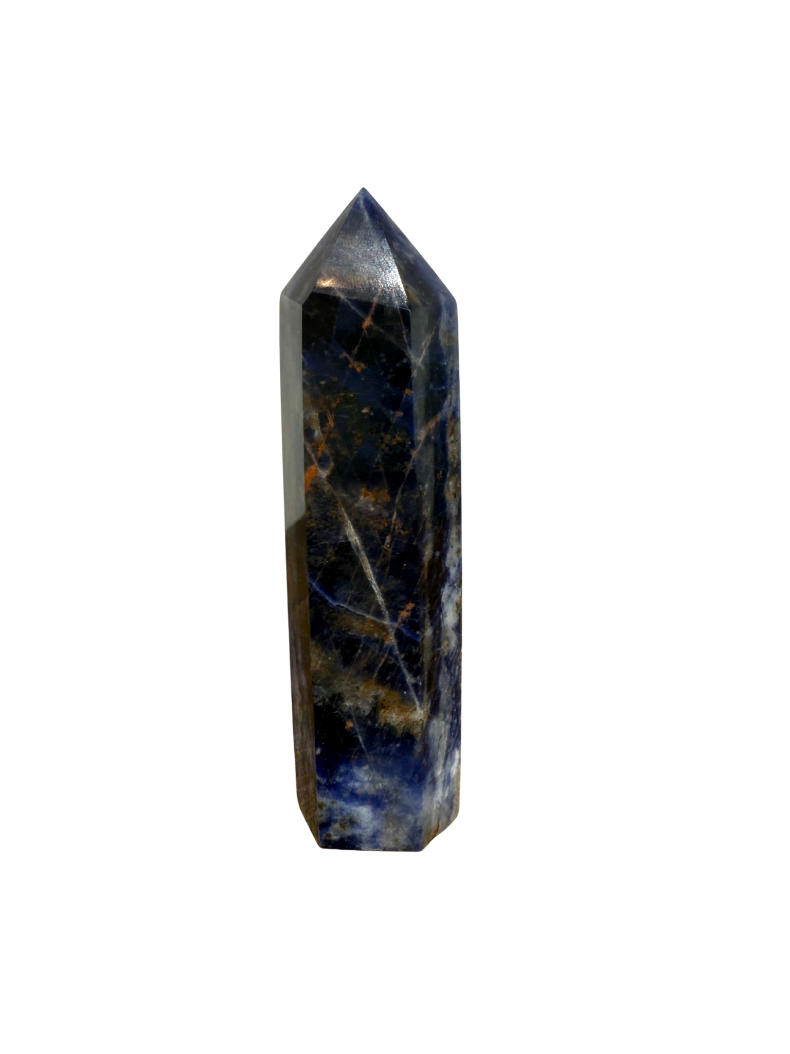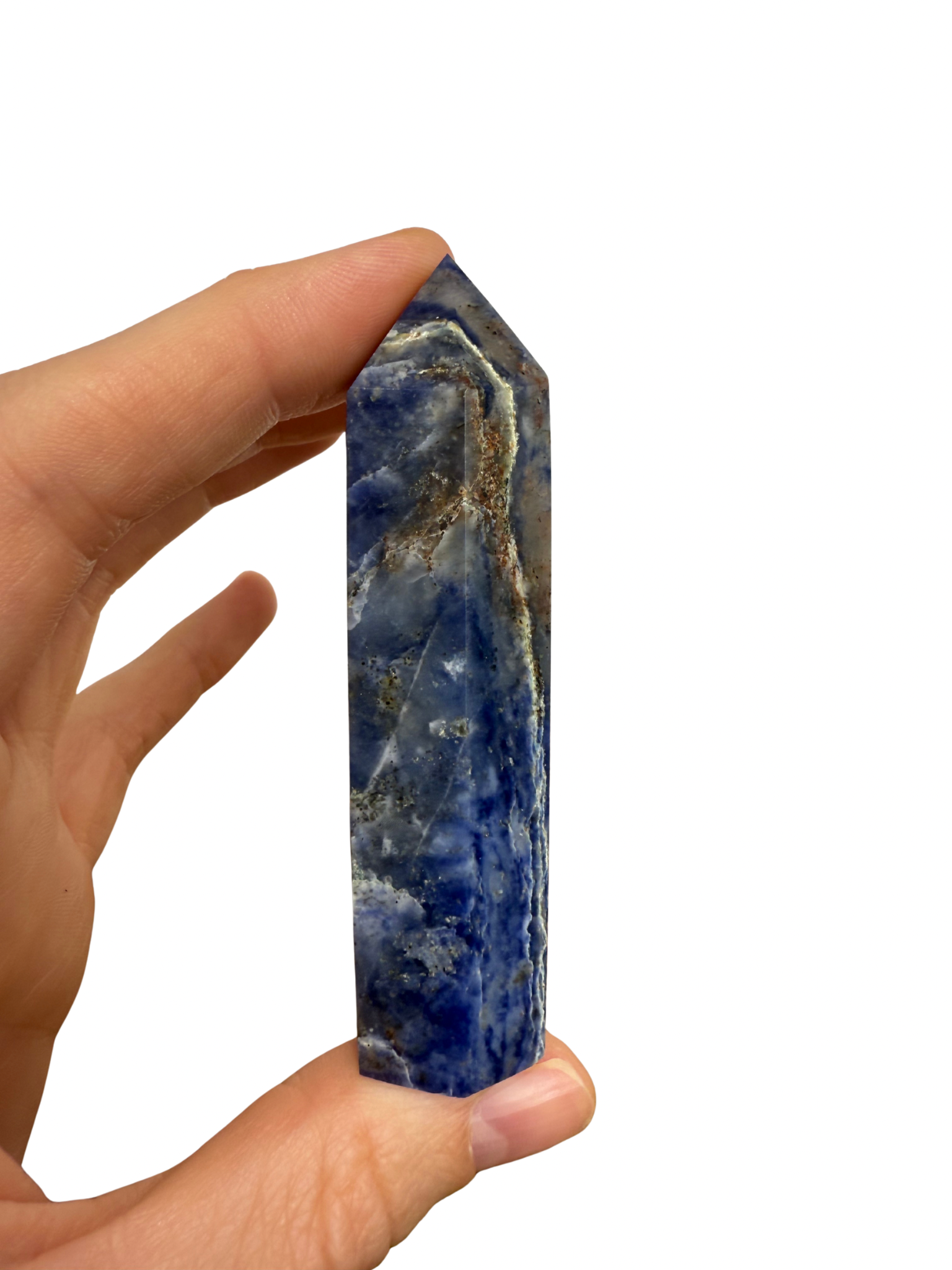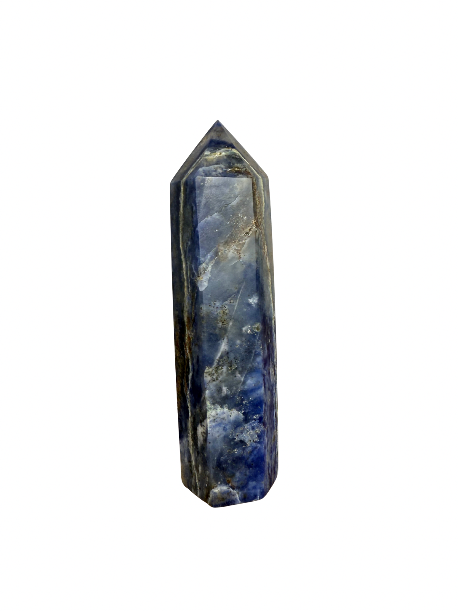 Deze prachtige Sodaliet toren combineert diepe blauwe tinten met witte aders. Sodaliet staat bekend als de steen van inzicht en communicatie, hij helpt je helder denken, eerlijk uitspreken wat je voelt en vertrouwen op je intuïtie.