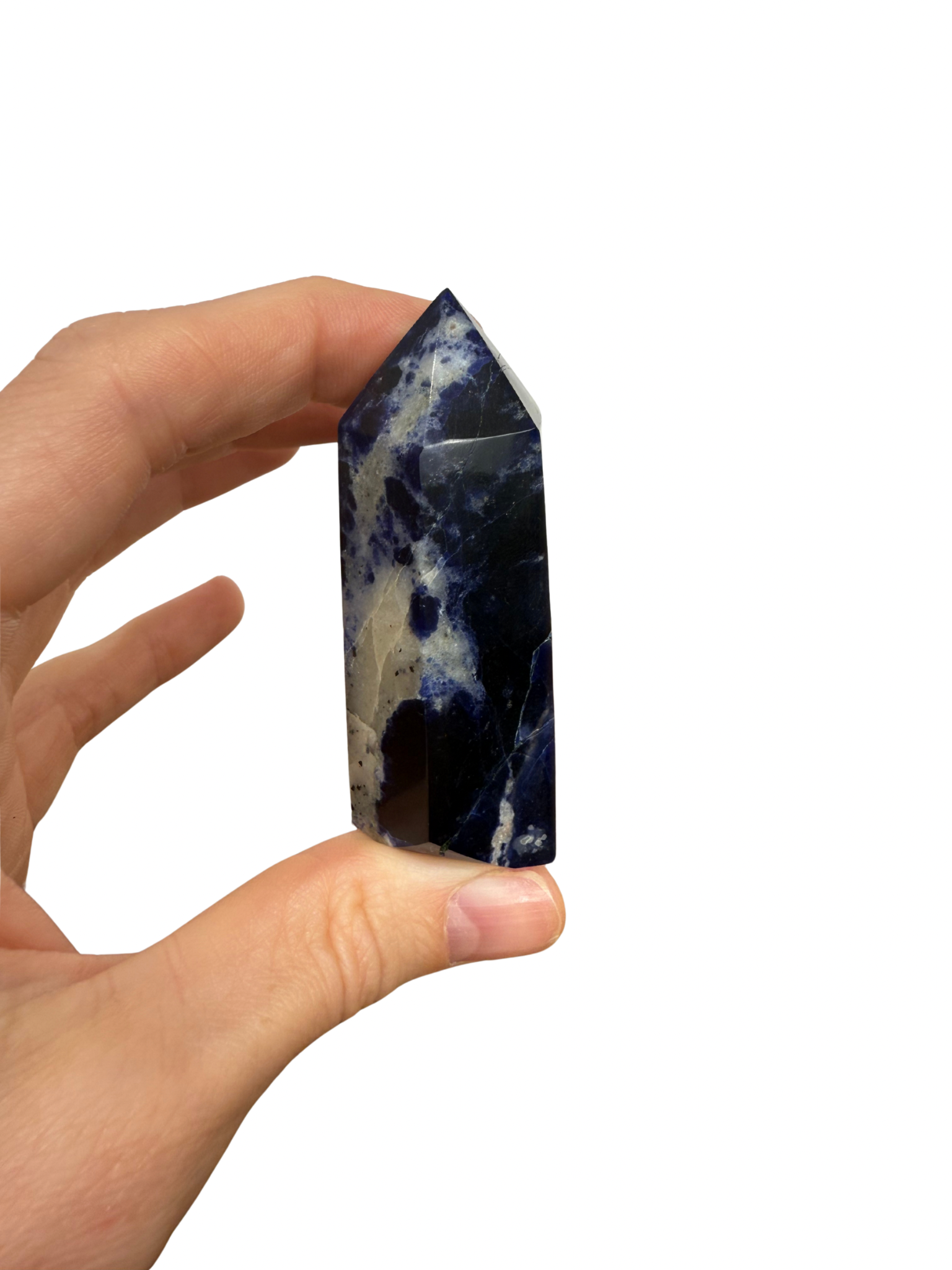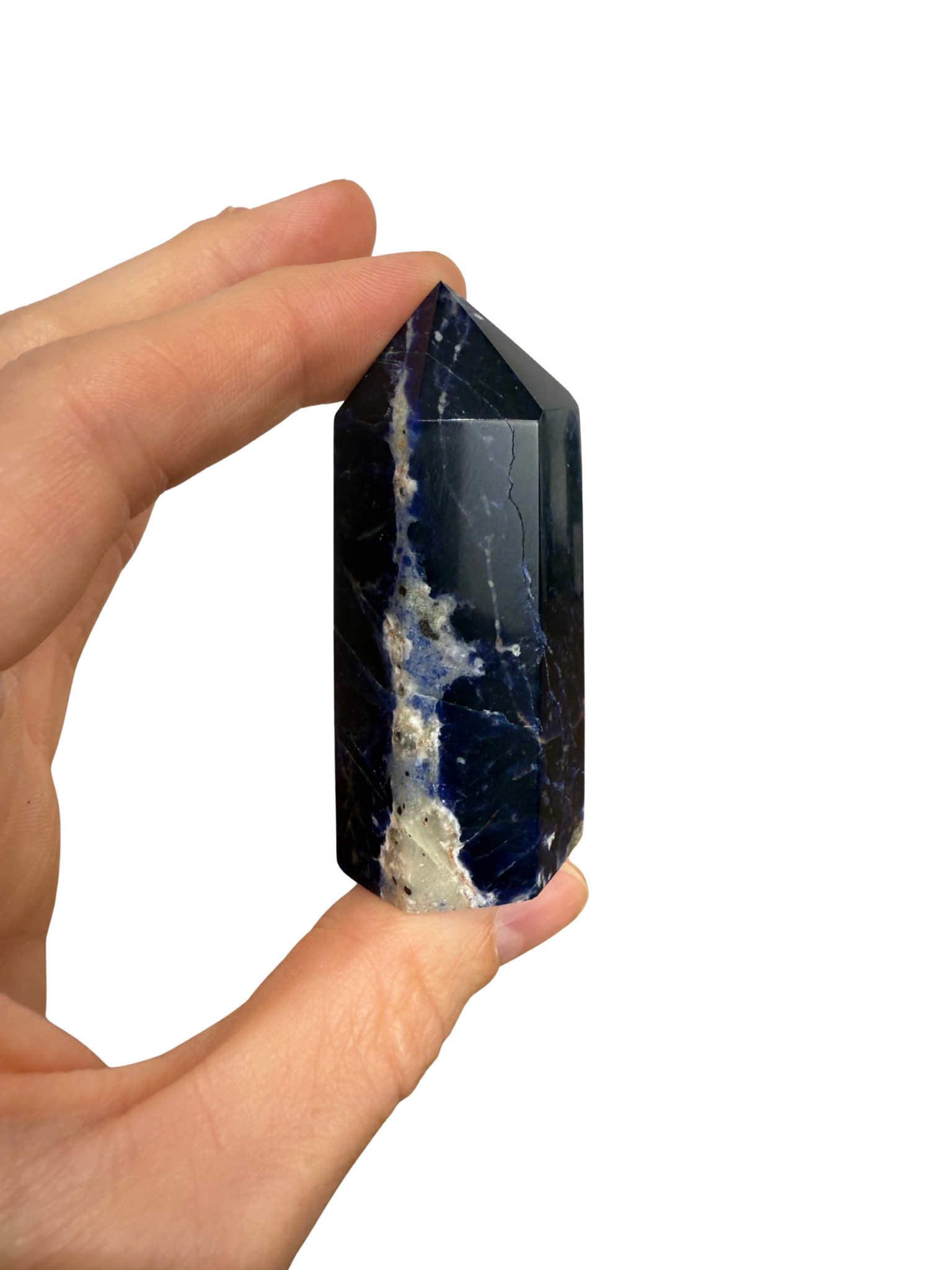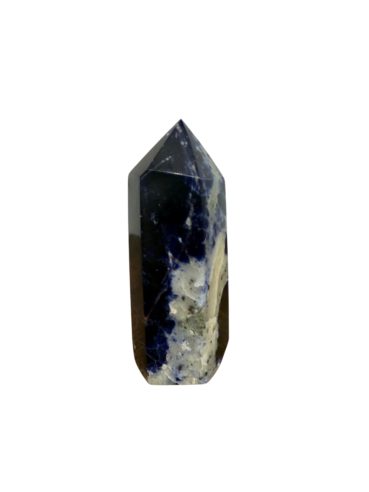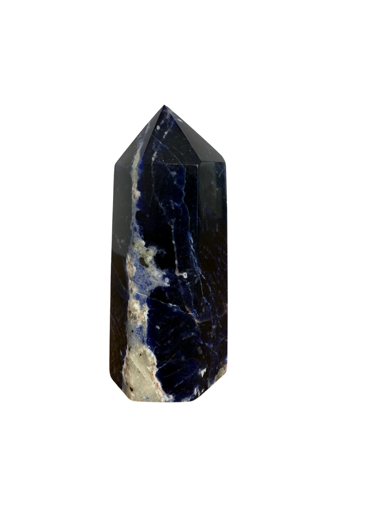 Deze prachtige Sodaliet toren combineert diepe blauwe tinten met witte aders. Sodaliet staat bekend als de steen van inzicht en communicatie, hij helpt je helder denken, eerlijk uitspreken wat je voelt en vertrouwen op je intuïtie.