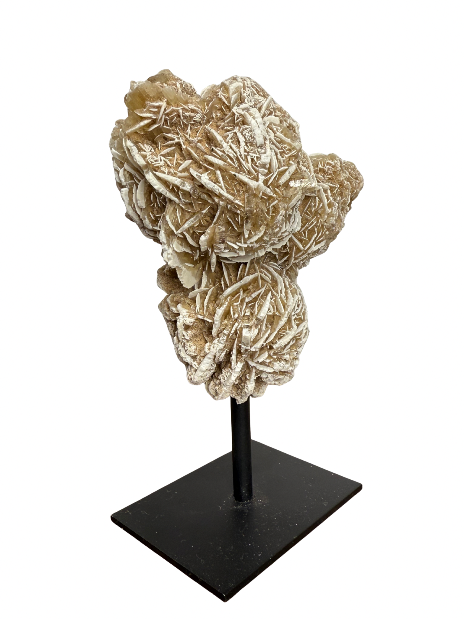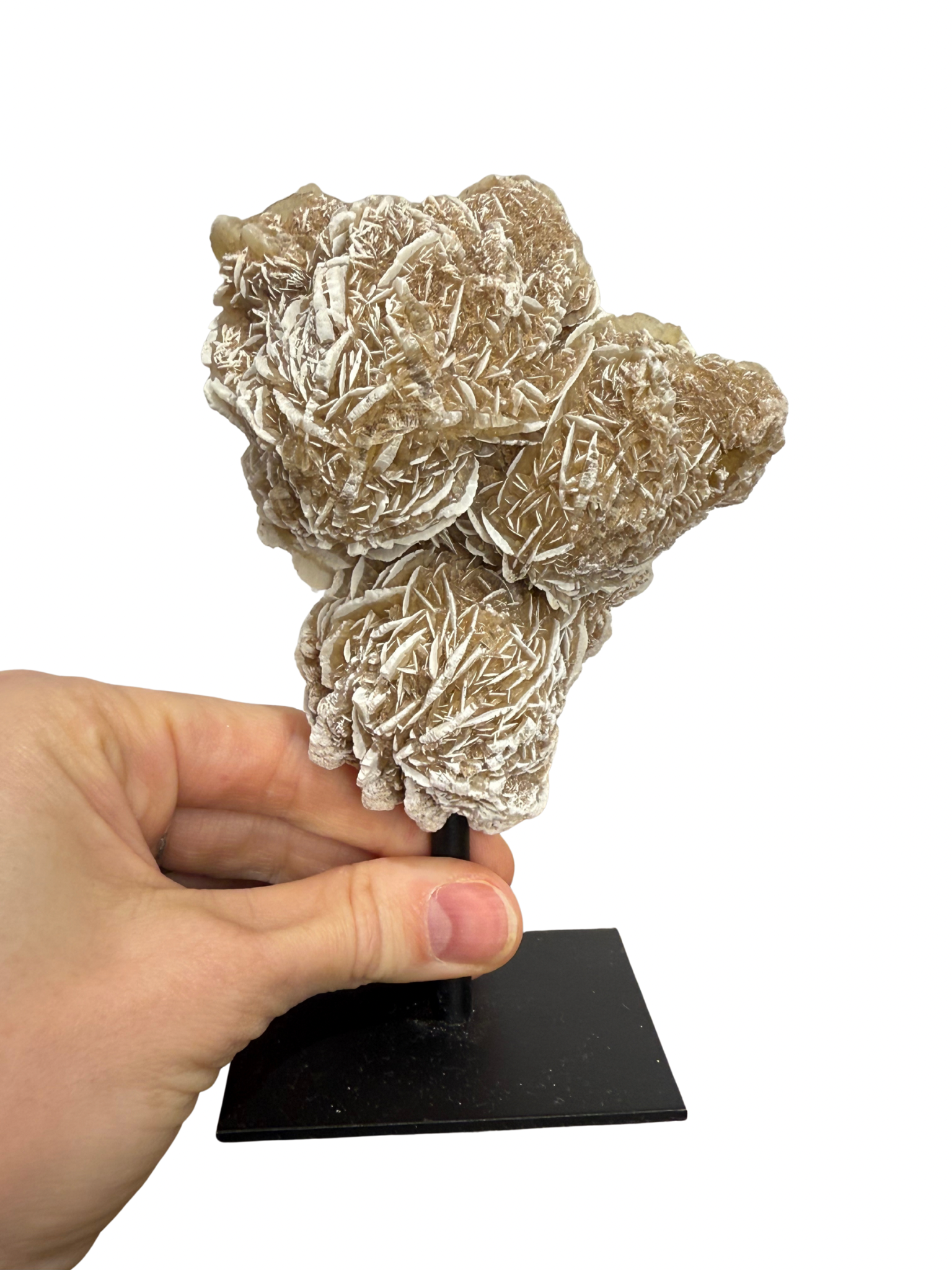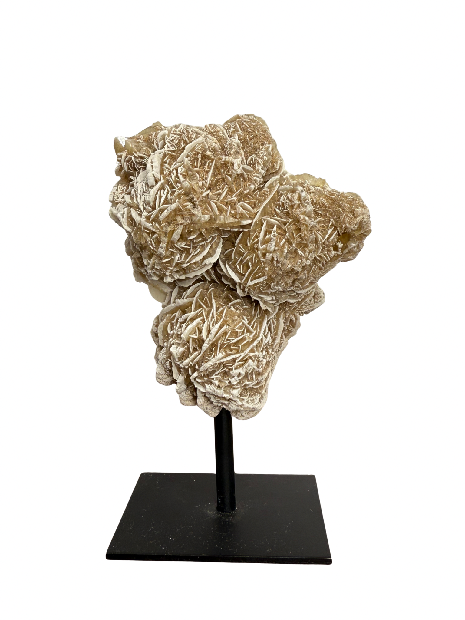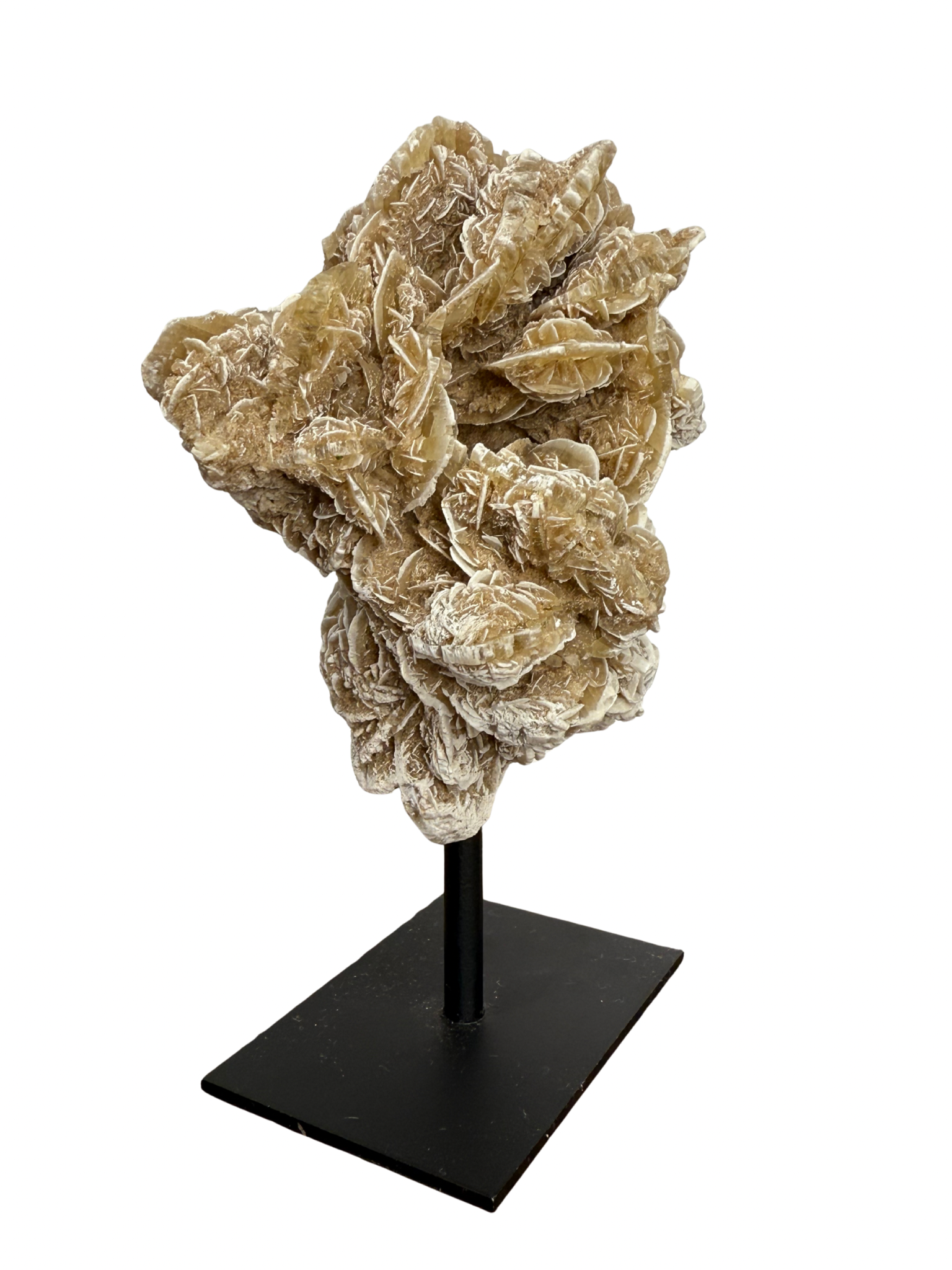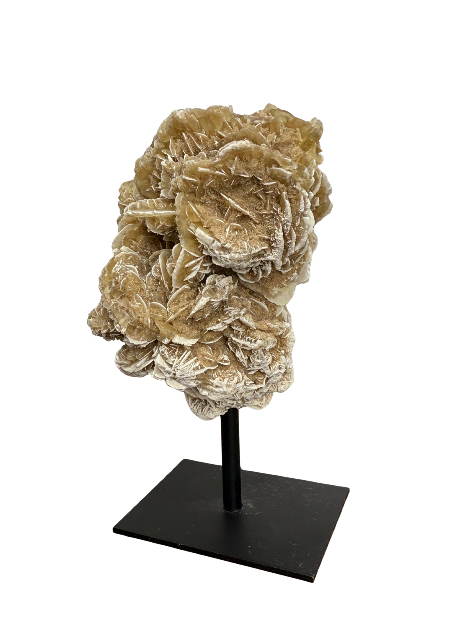 Deze Woestijnroos op standaard is een waar natuurwonder, gevormd uit lagen gips en zand die samen kristalliseren tot roosvormige structuren. De zachte, zandkleurige tinten stralen rust en puurheid uit.Â