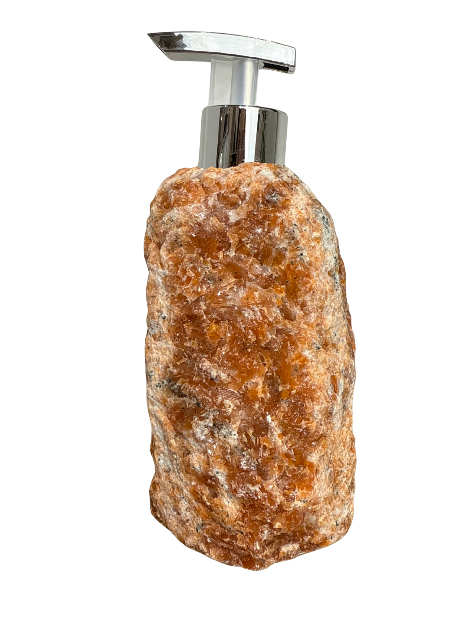 Deze prachtige zeeppomp van Oranje Calciet maakt jouw badkamer of keuken helemaal af.Â